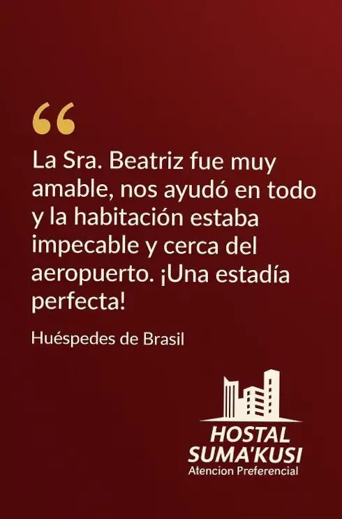 Hostal Sumak'usi はJuliaca市内に位置し、観光客にとって便利な立地となっています。施設には無料のWi-Fiをご利用いただけます。近くには多くの飲食店や観光スポットがあります。例として、私のスープは50メートル、ラ・カルピタも50メートルと非常に近い距離にあります。また、インカマンコカパック国際空港まで1.6キロでアクセス可能です。滞在中はドナ・ベアトリスというスタッフの方が親切に対応しており、部屋での紅茶作りサポートや空港送迎手配などを行ってくれました。